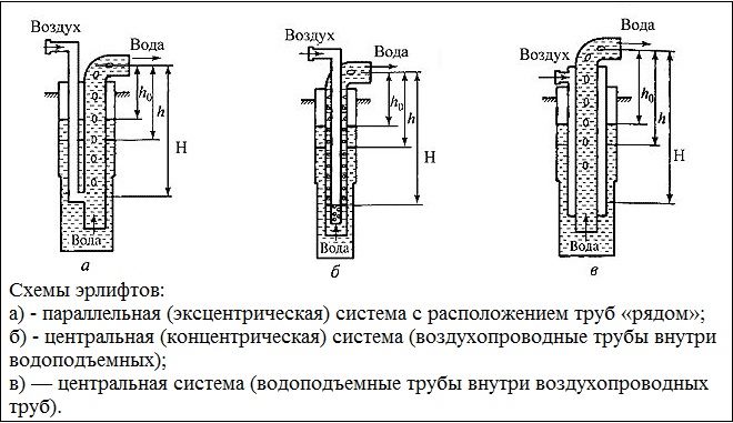 В эрлифтах используются три схемы расположения воздушных и водоподъёмных труб